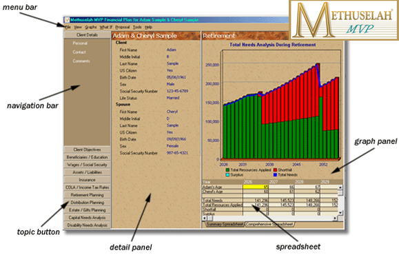 - Description: Over a ten year period we developed Methuselah, a financial planning software system with multiple levels of complexity, targeted specifically to the needs of the individual financial planner. Capabilities include Retirement, Estate, Distribution, Capital Need Analysis, Trust and Education planning. Used by top US financial firms.